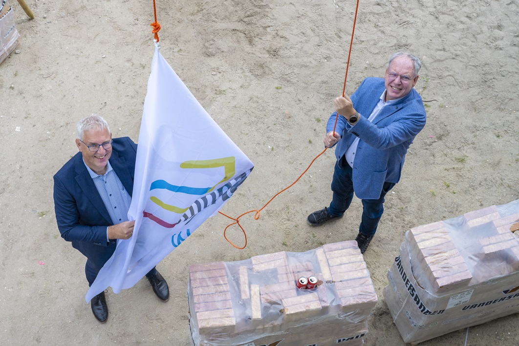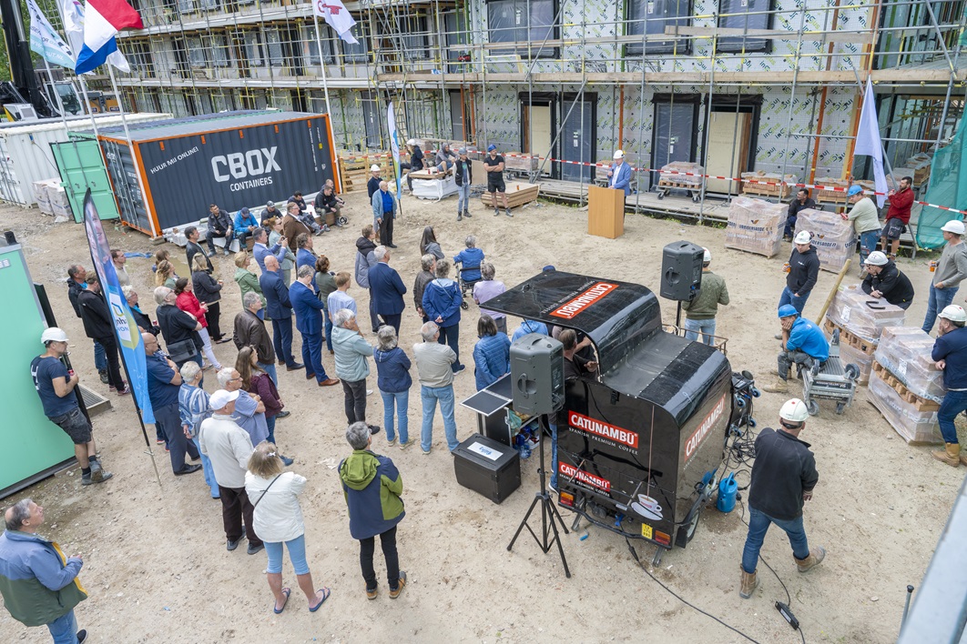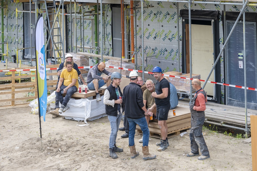 Rijnhart Wonen en aannemer Stout vierden donderdag 20 juni samen met gemeente Leiderdorp, omwonenden en partners het bereiken van het hoogste punt van de Pinksterbloem. De 92 moderne energiezuinige woningen voor de sociale huur worden begin 2025 opgeleverd.