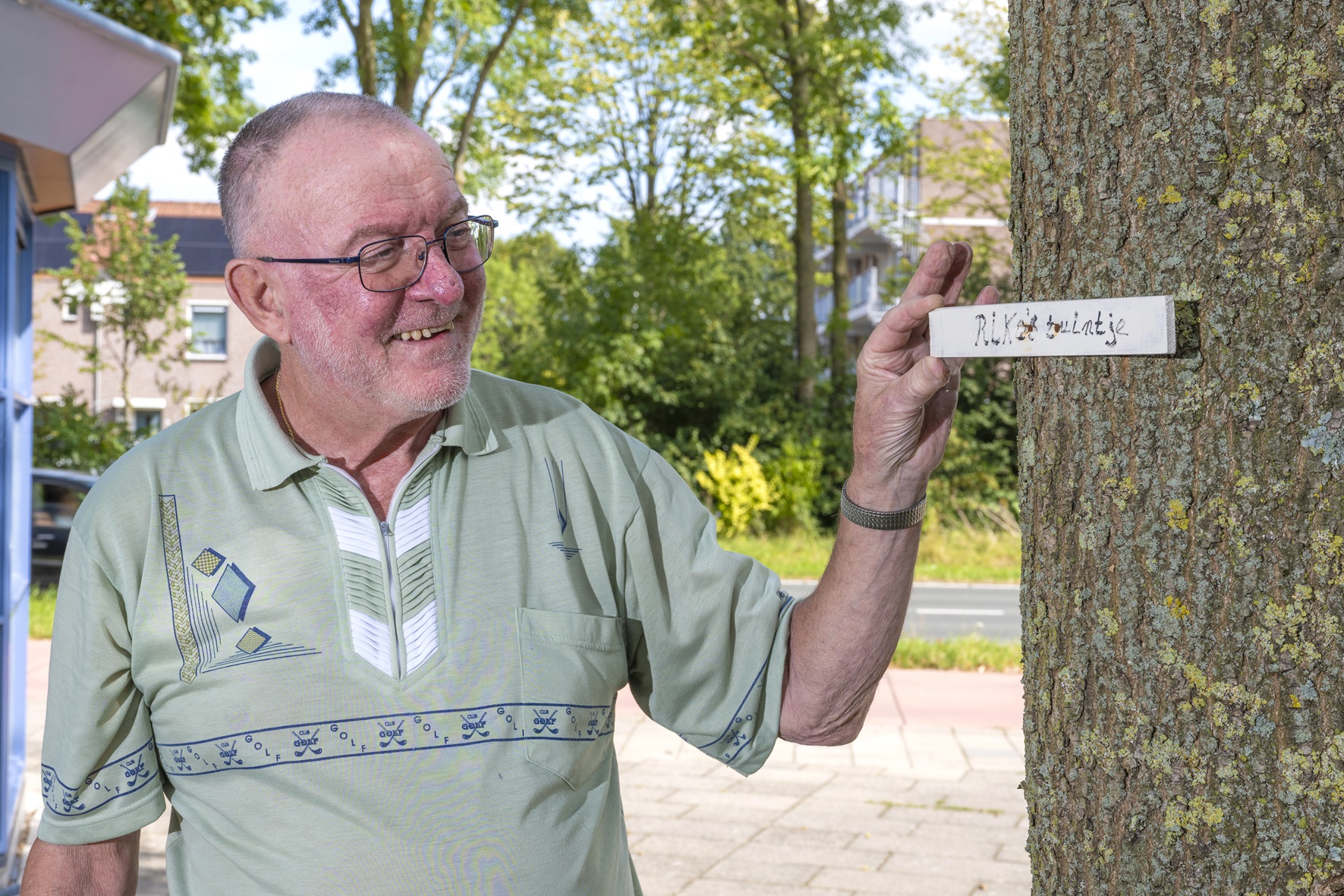 Voor de flat staat een charmant tuintje rond een boom. Jan zorgt er goed voor. "Dit tuintje werd aangelegd door mijn oude buurvrouw Rika. Ze plantte bloemen en hield het altijd netjes", vertelt Jan. "Toen haar gezondheid verslechterde, ben ik haar gaan helpen." Nadat Rika moest verhuizen, nam Jan de zorg voor de planten verder over. "Rika is helaas overleden. Er hangt nu een bordje in de boom met de tekst ‘Rika’s tuintje’, als eerbetoon aan haar. Haar kinderen, die hier vlakbij wonen, waarderen dit aandenken enorm."