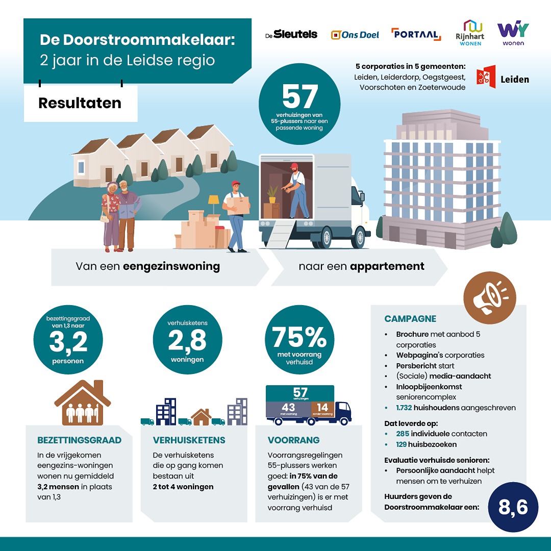 Met gerichte communicatie via kranten, brieven, flyers en gesprekken heeft de Doorstroommakelaar 57 verhuizingen van 55-plussers gerealiseerd naar een passende woning. De vrijgekomen woningen bieden nu ruimte aan gemiddeld drie bewoners in plaats van één. Huurders waarderen de aanpak met een rapportcijfer van 8,6.