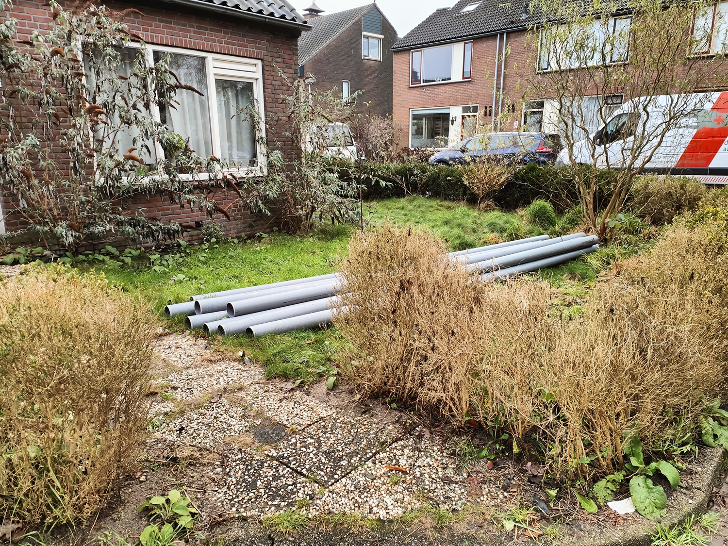 In Zoeterwoude hebben we iets soortgelijks gedaan bij de Zuidhof. Daar hebben we de regenpijpen van de voorkant van de huizen aangesloten op het schoonwaterriool. Projectleider Jurjen Tees: “De gemeente heeft in de straat een sleuf gegraven voor de nieuwe buis. Hiervoor moesten we ook een beetje graven in de voortuin van bewoners, maar na afloop lieten we die weer netjes achter."
