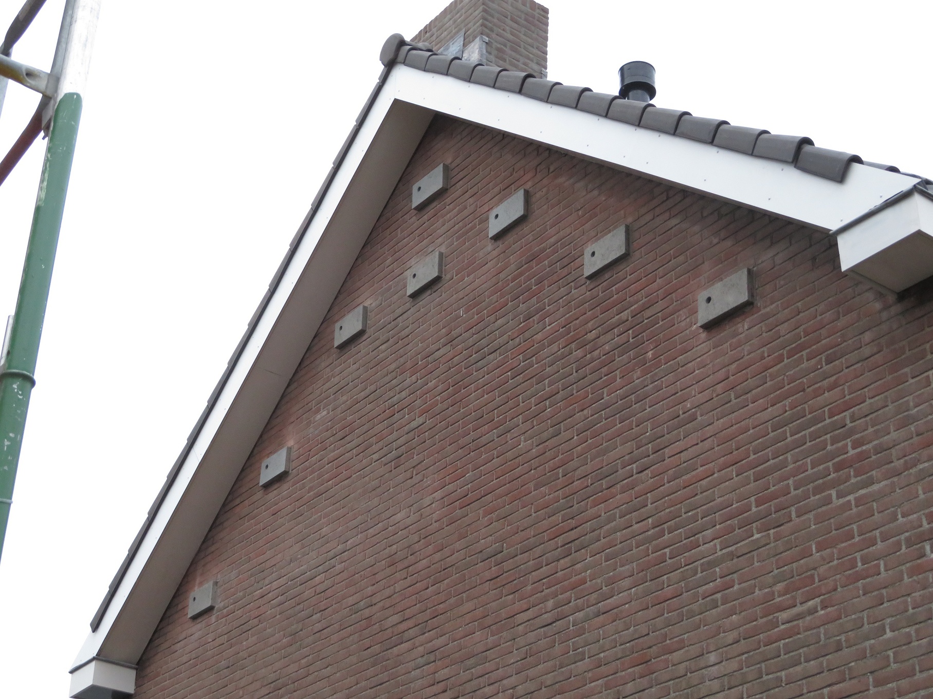 “Meestal treffen we bij woningen de gierzwaluw, de gewone dwergvleermuis of de huismus aan”, legt Armel Brinkman uit, ecoloog bij KP Adviseurs. “Deze dieren moeten eerst een nieuwe verblijfplaats krijgen, voordat Rijnhart Wonen kan beginnen met verbouwen. En dat kost tijd. Voor het onderhoud aan de eengezinswoningen in de Bonifaciusstraat begonnen we bijvoorbeeld al in 2020 met de onderzoeken. We kijken eerst welke diersoorten er zitten, hoeveel het er zijn en hoeveel verblijfplaatsen ze hebben. Omdat er vleermuizen en huismussen bij de woningen zaten, hebben we tijdelijke vleermuiskasten en nestkasten opgehangen in de omgeving. Daarvoor vragen we om toestemming bij de provincie. Na akkoord van de provincie en pas als alle vleermuizen en huismussen uit de woningen zijn verhuisd, kan Rijnhart Wonen met de werkzaamheden beginnen.”